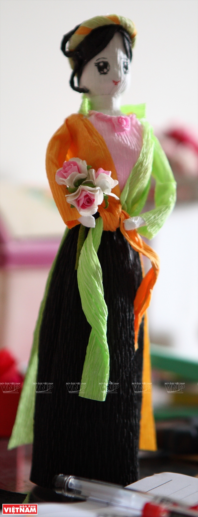 After that, Huong cuts and pastes several layers of paper to make clothes, hair and forms the face.