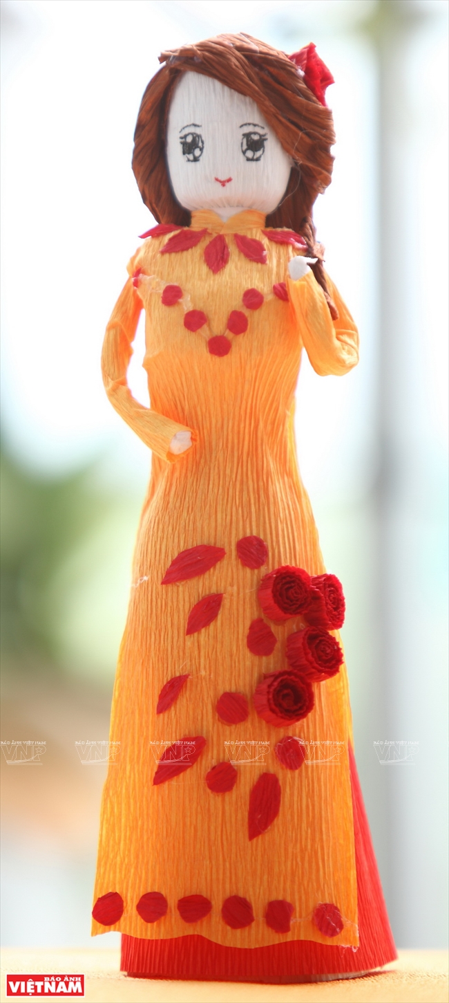 Cute paper dolls each with a different appearance resembling famous people are unique handmade products embellished with Vietnamese cultural features for foreign visitors. They represent the passion and creativity of a young girl who is as adorable as the dolls she makes.