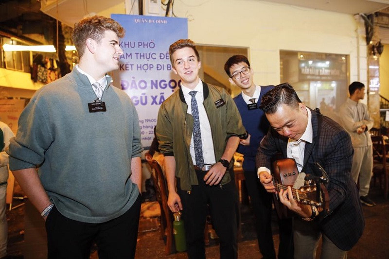 | Young foreign visitors join a Pearl Island- Ngu Xa art performance. Photo: Duy Khanh |