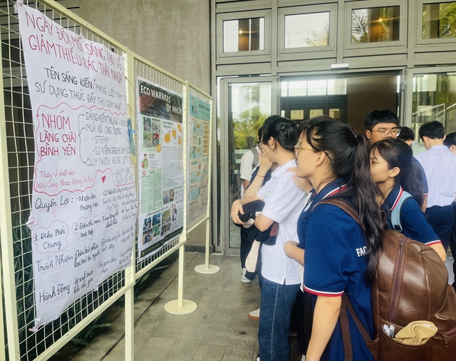 | Youth read posters about waste reuse and recycle in a festival held in Ghềnh Ráng Ward, Quy Nhơn City. — VNS Photo Thu Trang |