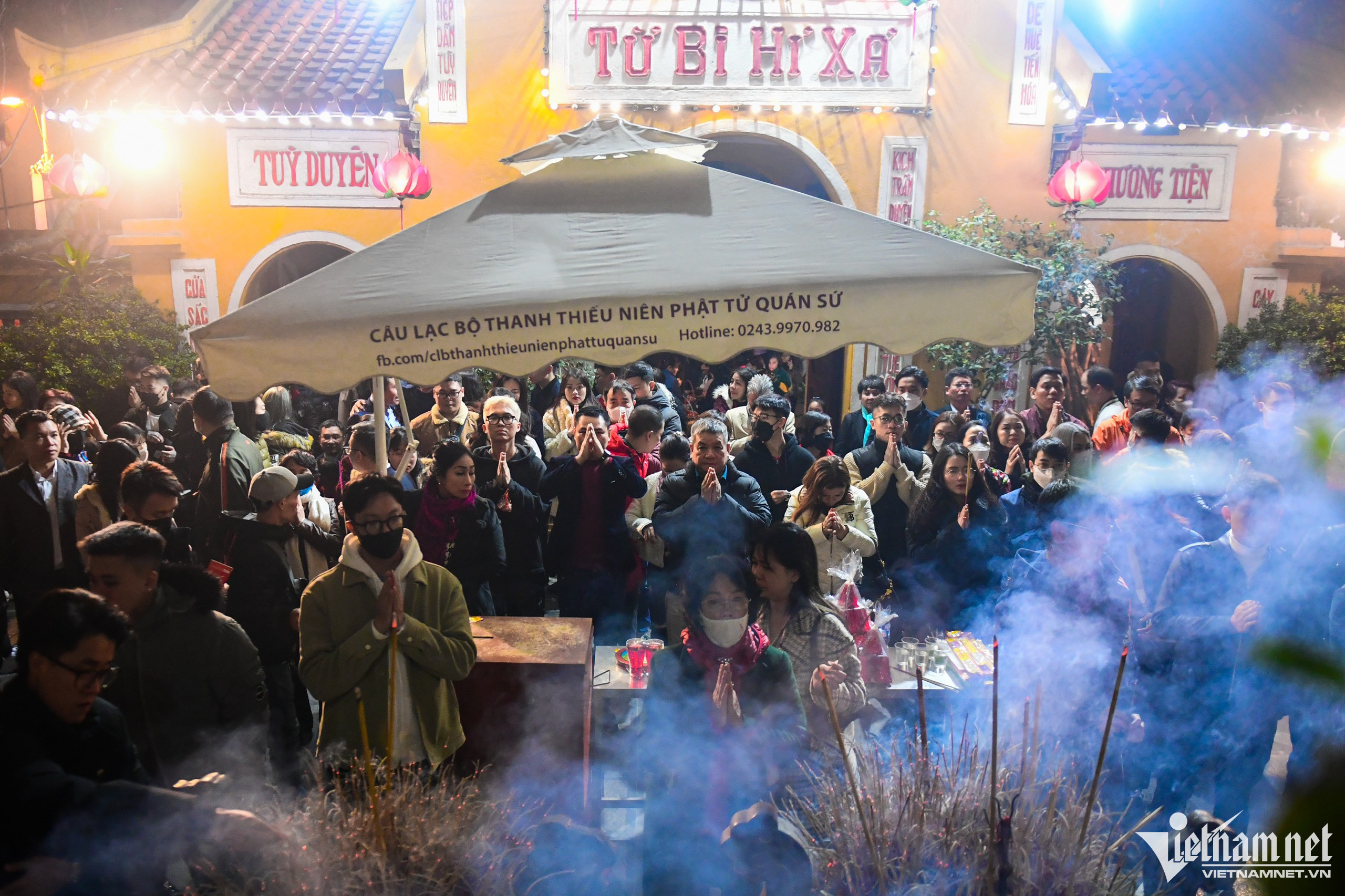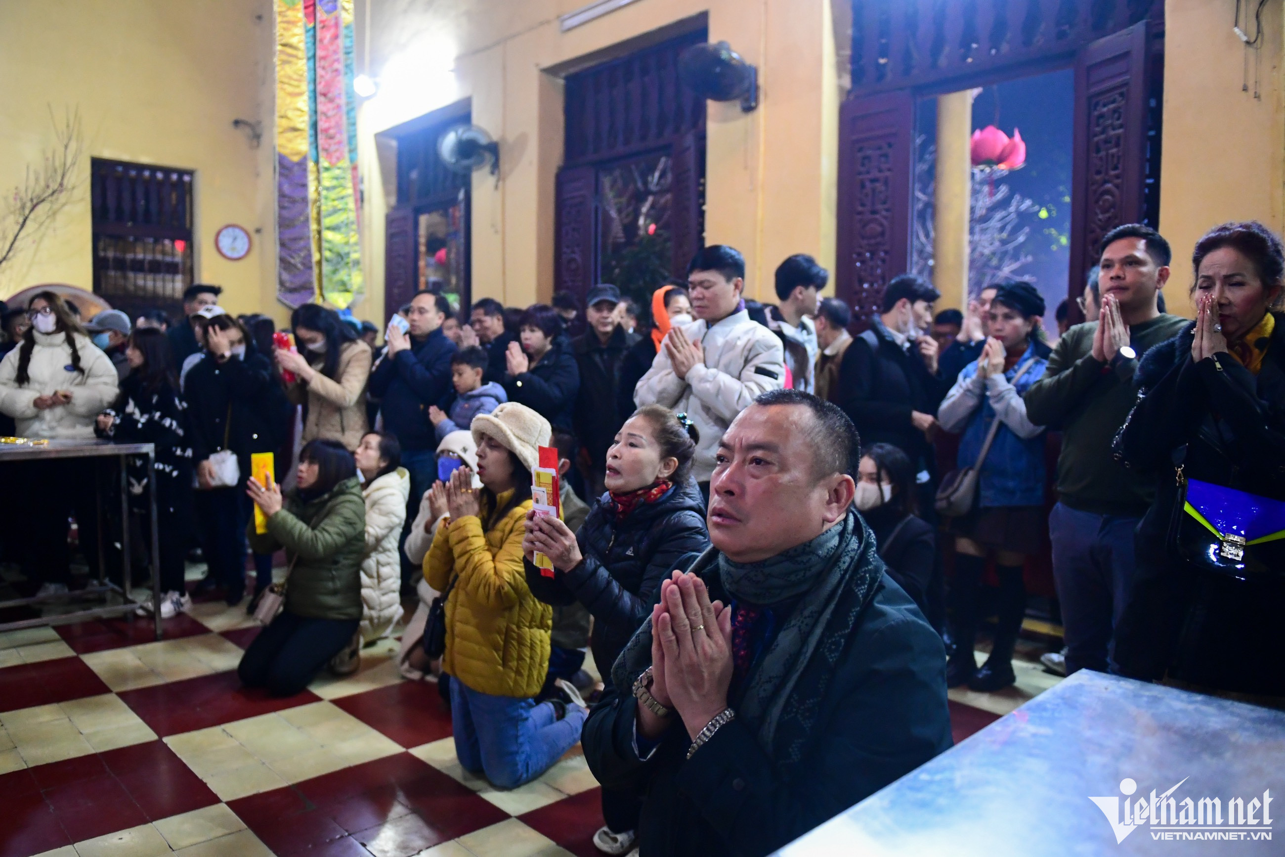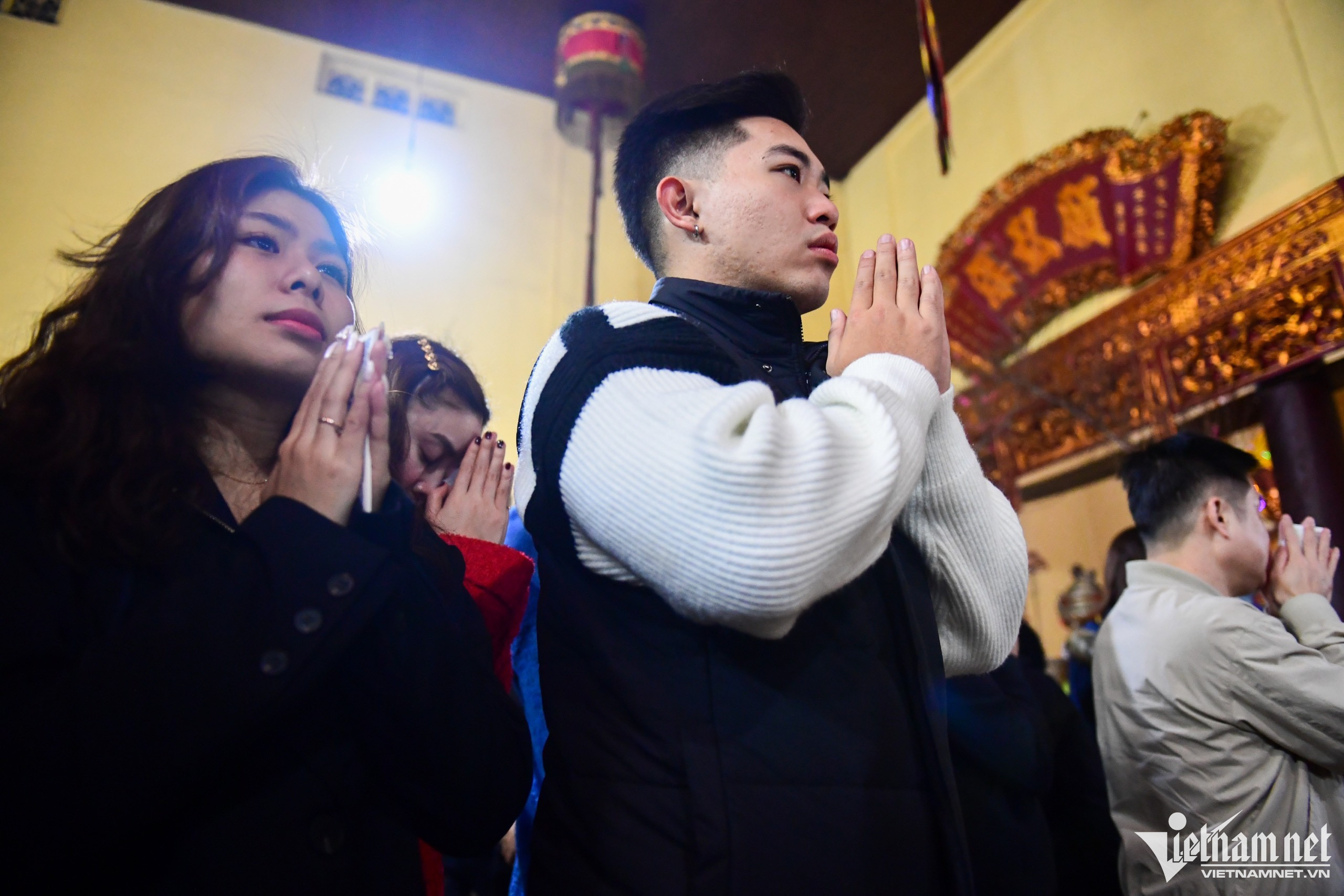 Vietnamese people typically go on a pilgrimage at the beginning of each Lunar New Year in order to pray for safety, health, good luck, prosperity, and happiness during the year ahead. When the clock strikes midnight on New Year’s Eve, many people begin their pilgrimage to nearby pagodas in order to pray for health and luck for both themselves and their loved ones. Photo: At Quan Su PagodaOutside the temple door, stalls sell all kinds of worshipping items.Many citizens sincerely believe that all of their wishes made on New Year’s Eve will come true.The young couple Minh Duc and Minh Ngoc have always kept the habit of going to pagoda after New Year's Eve for more than 20 years. At Quan Thanh Temple.Many people go to a pagoda to say goodbye to the old year and welcome in the new-year.Vietnamese people believe that the act of going to a pagoda is not just about praying for good things in the coming year, but also serves to reflect on what they have done in the past and leave all hardship behind.Buying salt is a traditional custom that Vietnamese people have observed for centuries. It’s believed that salt is capable of warding off evil spirits and bringing good luck for the family over the course of the coming year.