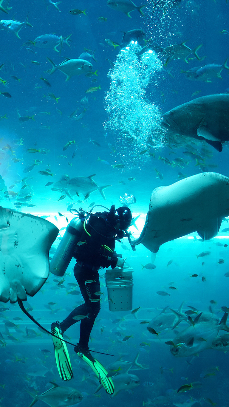 There is a transparent acrylic glass tank of 200m2 wide simulating an ocean scene with many species of marine life.