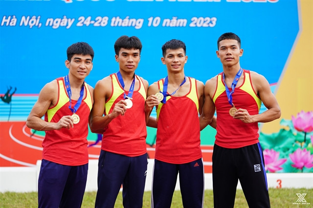 | Lê Ngọc Phúc (2nd left) and his Hà Tĩnh teammates pose with their gold of the National Athletics Championship's 4x400m relay. — Photo Xmax Media |