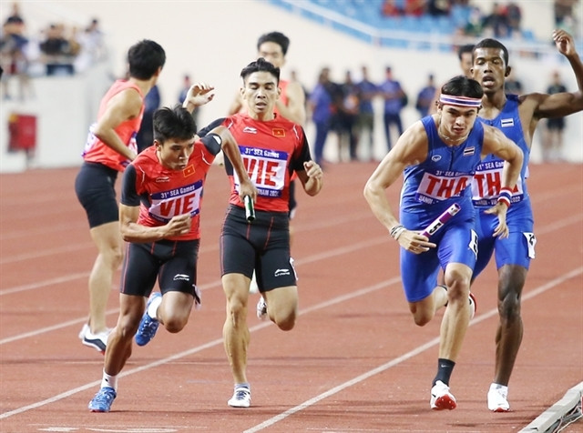 | Lê Ngọc Phúc (left) participates in the 31st SEA Games' 400m relay race. Việt Nam earned silver but it was stripped after a positive test for an illegal drug. — Photo baohatinh.vn |