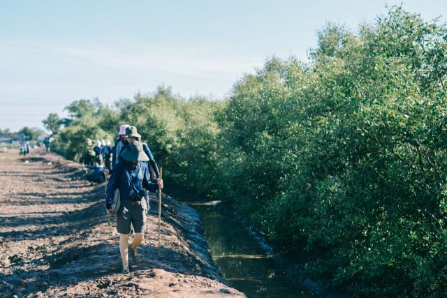 | Local residents and volunteers trek in the newly planted mangrove forest in Sóc Trăng province. Tree-planting trips are included in a series of actions in the mangrove afforestation project by Sống Foundation in 2021-23. — Photo courtesy of Forest Symphony |