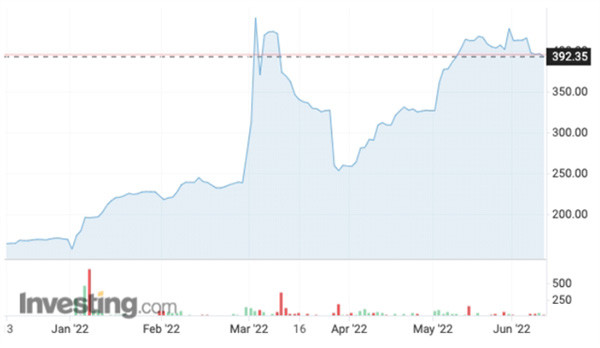 On the Intercontinental Exchange (ICE), Australia’s Newcastle thermal coal contract for June delivery was traded at US$392.35 a tonne on June 10, below the peak set in early March at nearly $446, but still a jump of nearly 132 per cent since the beginning of the year.