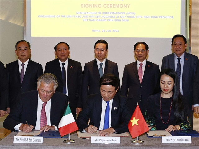 Vietnamese President Võ Văn Thưởng on July 26 in Rome witnessed the signing of a memorandum of understanding between the People’s Committee of south-central province Bình Định and H20 Racing on cooperation in organising UIM F1H20 Grand Prix and UIM-ABP Aquabike Grand Pix Bình Định 2024 in Quy Nhơn City.