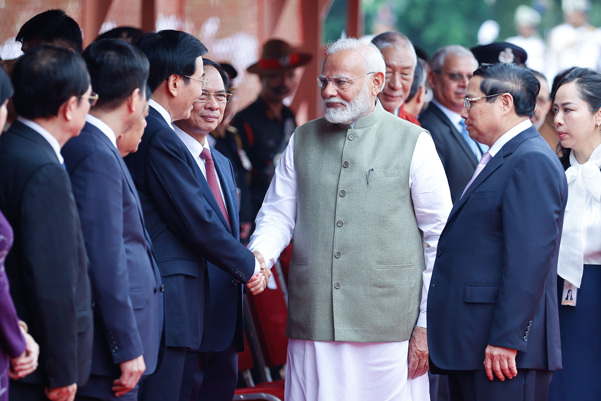 The ceremony included a review of the Indian Army's Honor Guard, with Prime Minister Pham Minh Chinh walking solemnly along the red carpet towards Prime Minister Narendra Modi and Indian officials. The two prime ministers introduced and shook hands with each member of their respective delegations, posing for commemorative photos before concluding the ceremony.