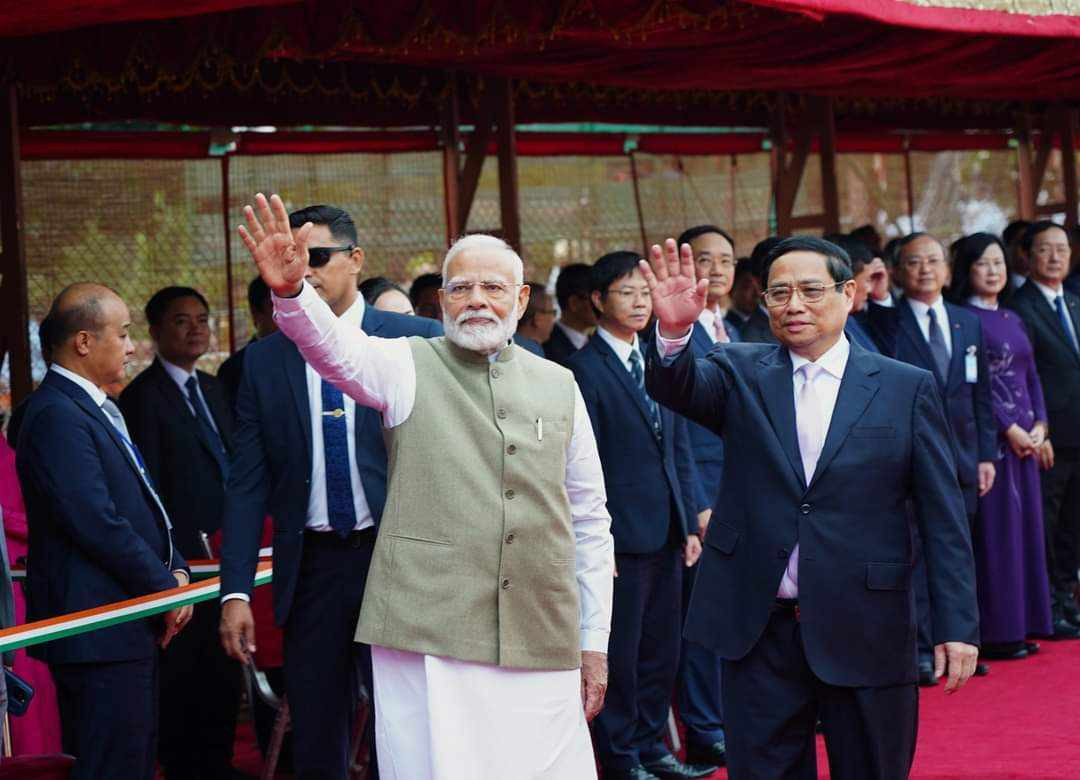 Prime Minister Narendra Modi greeted Prime Minister Pham Minh Chinh with a warm embrace, symbolizing the deep and enduring relationship between the two nations. The two leaders held hands firmly, reflecting the strong and lasting bonds between Vietnam and India, nurtured over generations of leadership.