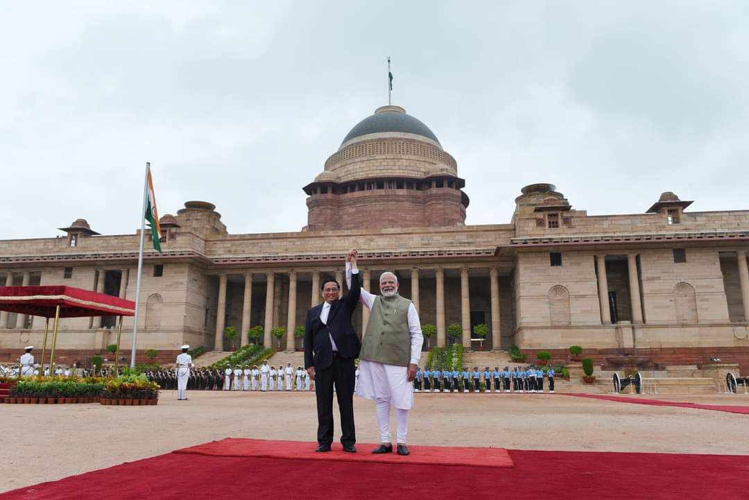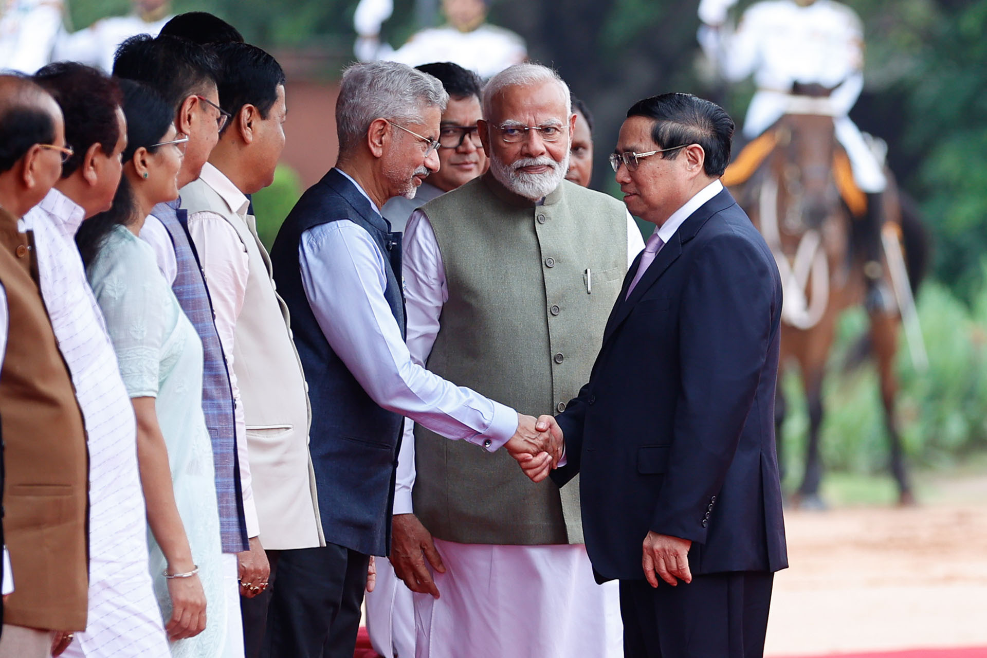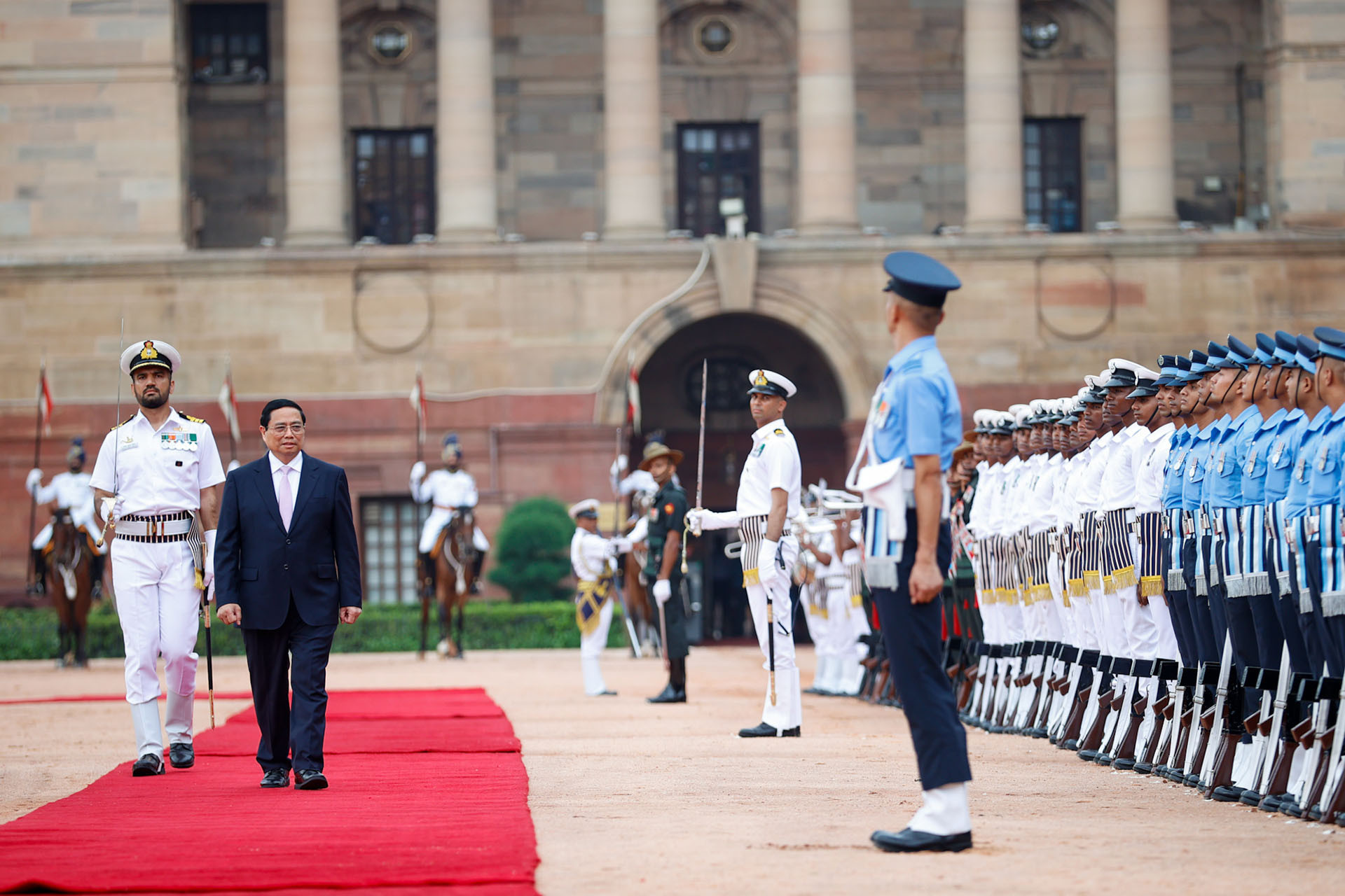 Prime Minister Pham Minh Chinh was warmly received by Indian Prime Minister Narendra Modi during a ceremonial welcome at the Presidential Palace in India on August 1.