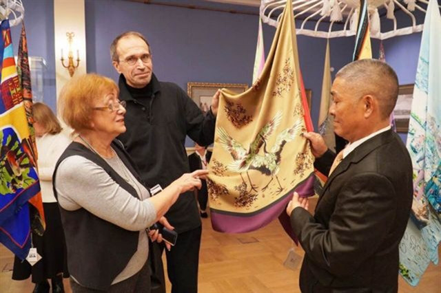 | A high quality silk scarf with special design and pattern made in Bảo Lộc is introduced to foreign visitors from Russia. Photo courtesy of Vietnam Silk House |