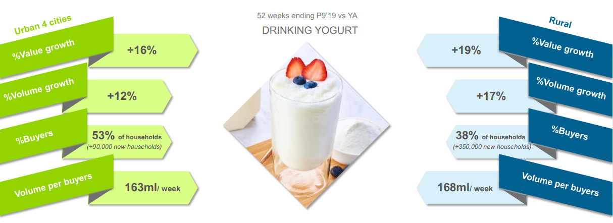Together with the positive performance of Dairy, Drinking Yogurt has recovered in 4 urban cities and is accelerating growth in rural areas, mainly by winning back consumers. This category still has room to tap into in order to both expand consumer base and increase volume consumption.
