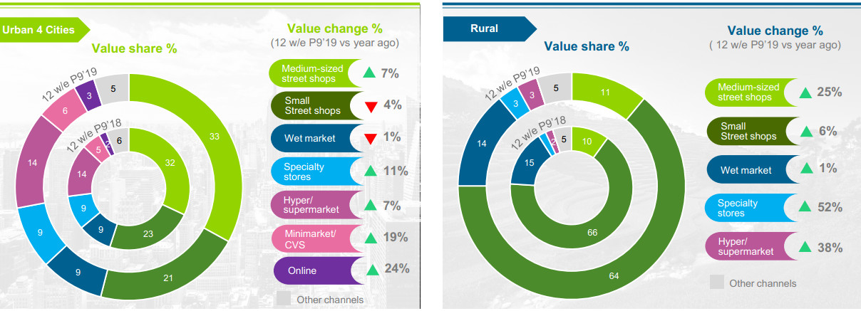 Online, minimarkets & convenience stores continue leading the FMCG growth and growing in importance in 4 urban key cities. In rural areas, healthy growth is observed across all channels.