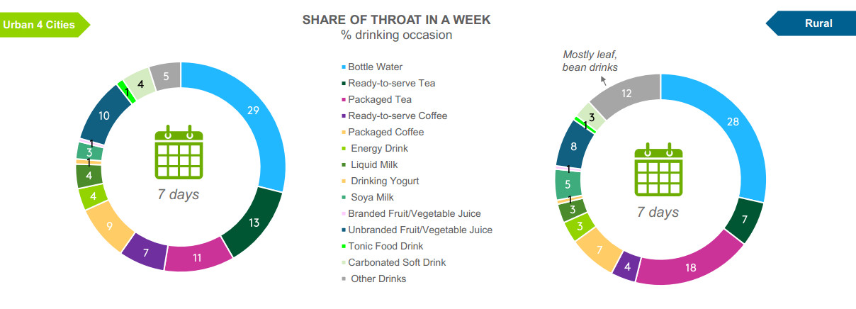A survey conducted by Kantar on drinking habit shows that about two third of drinking occasions in a week is for bottle water, tea and coffee. Besides, unbranded juices (fruit/vegetable) is ranked fourth among non-alcoholic beverages that consumers drink every week.
