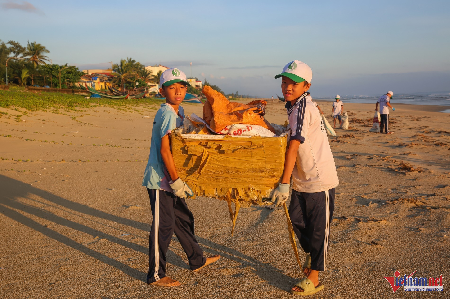 Nguyen Nhuan Thao (12 years old), who was busy helping a friend carry a large trash bin washed ashore by waves, said, "I've been part of the team for two years. Every weekend, I go to the beach to pick up trash with my friends. I feel happy to contribute to keeping the environment clean."