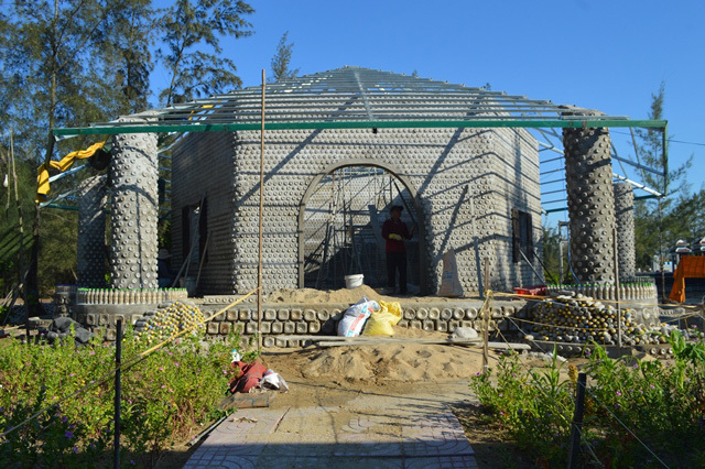 Over two months ago, after noticing the rubbish around Duc Lam Pagoda and the beach in Duc Loi Commune, Monk Thich Hanh Nhan and the local people cleaned up the area and collected over 60,000 plastic bottles. The bottles were brought to the pagoda to be classified, washed and used to build a unique house.