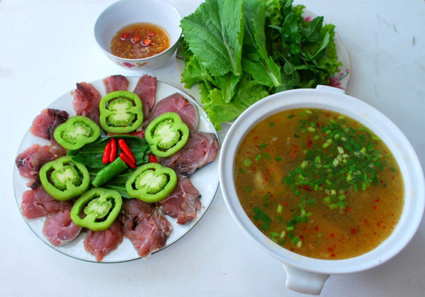 Diners first dip the marinated mackerel fillets and herbs into the boiling broth. They are then wrapped in rice paper, dipped into the sauce and enjoyed.