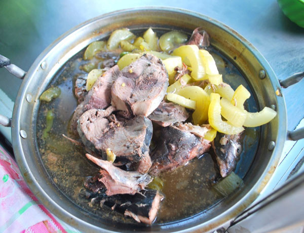 For the second specialty, mackerels cooked with pickled muskmelon (Cucumis sativus) melon, fresh mackerels and pickled muskmelon are cleaned and cut into slices.