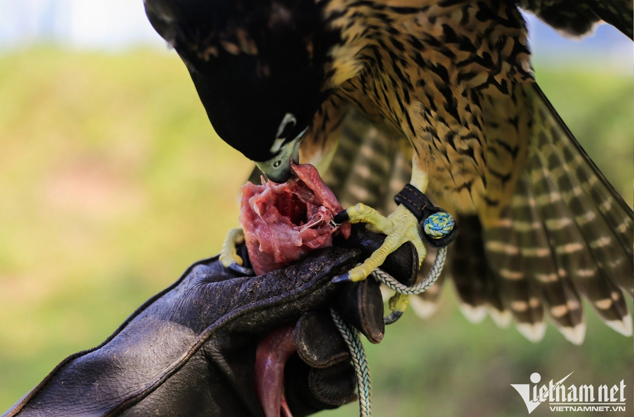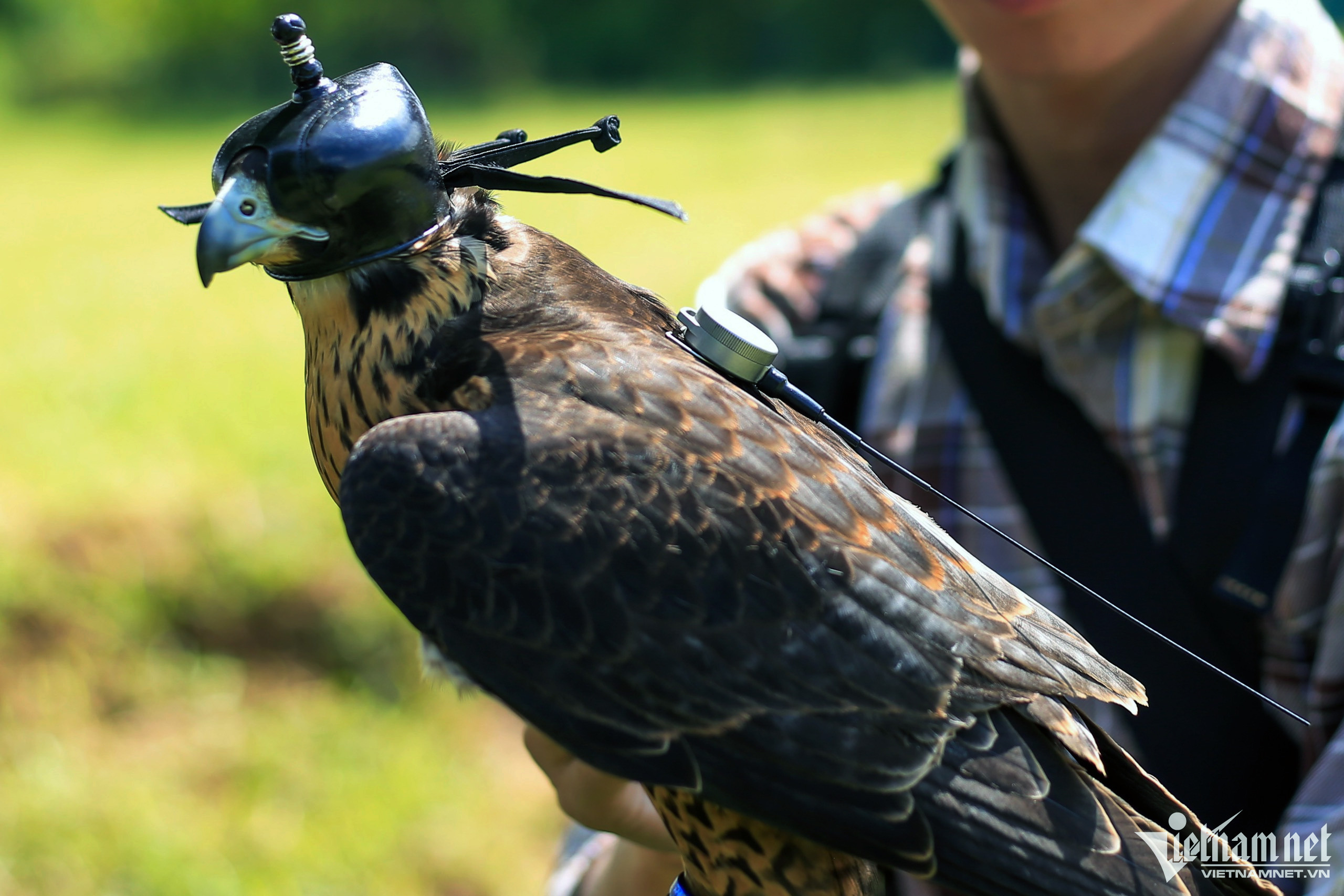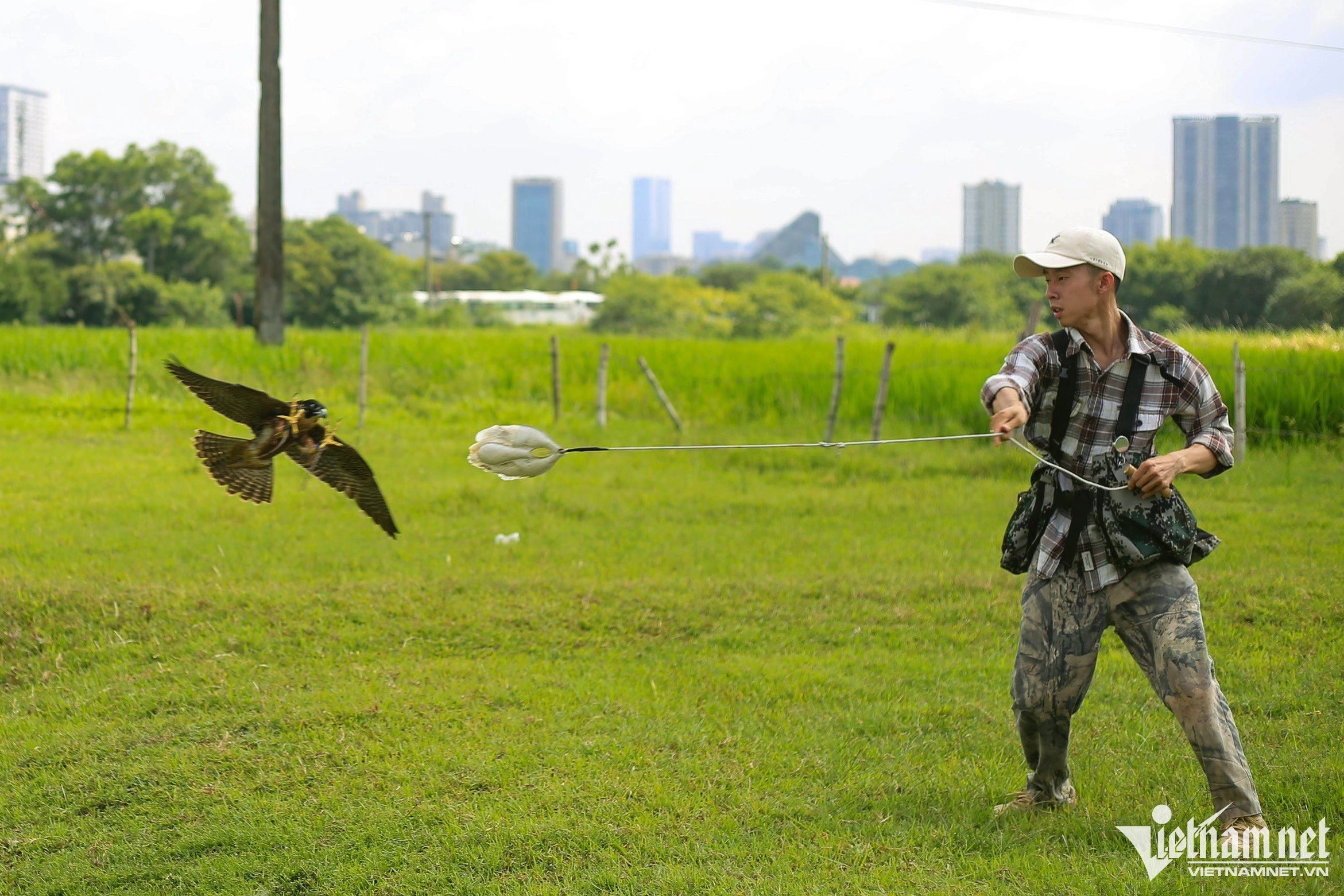 Training birds of prey entered Vietnam 10 years ago. In the photo, Mr. Duong Tien Sinh's group often trains birds in an open field in Trung Van ward, Nam Tu Liem district.Birds of prey are trained with four exercises: standing and eating on gloves, passing hands, grabbing prey in the air and hunting naturally. Among species of raptors, the falcon is dubbed as the "sky killer". They have good hunting ability and their flying speed in the wild can be up to 320km/h.The trainers take care of the falcons when they are young and the training begins when the birds are nine months old. Each falcon is priced from 800,000 to 2 million VND. The falcon is characterized by bright eyes, wide wings, a beak and sharp claws that help them bite and tear food. The birds’ instinctive hunting and wild personality cannot disappear totally. To prevent them from flying away, the trainer must attach a GPS device to their back. The device is priced at 30 million VND/unit.To conquer raptors, it takes trainers about 3-6 months to get used to them. Mr. Phillip, a South African national who has been in Vietnam for three years, is a member of Sinh’s raptor training group.According to Mr. Viet, another member of the team, training wild birds takes a lot of time, and requires patience as well as understanding of their habits and preferences. In the photo is an eagle which is priced at 3 million VND.Flycams are used to attract birds of prey away.