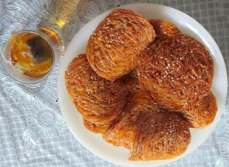These strips are mixed with a few drops of vanilla extract andfried in hot coconut oil. A huge ladle is used to press down the strips to the bottom of the pan to form a round shape. As the cakes look like re, what the Vietnamese call a bamboo basket, the cakes are named after them.