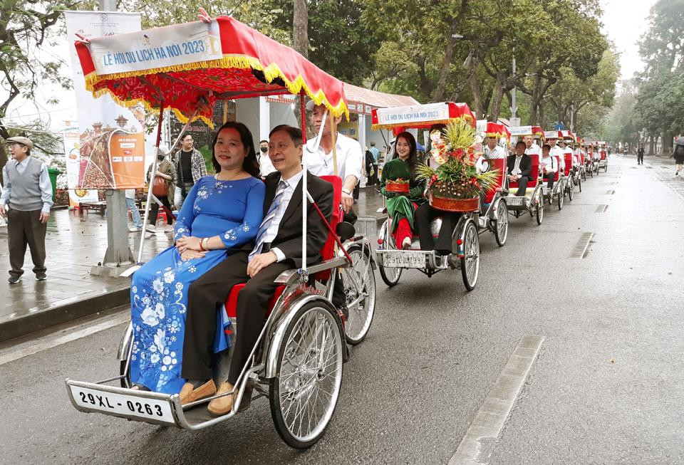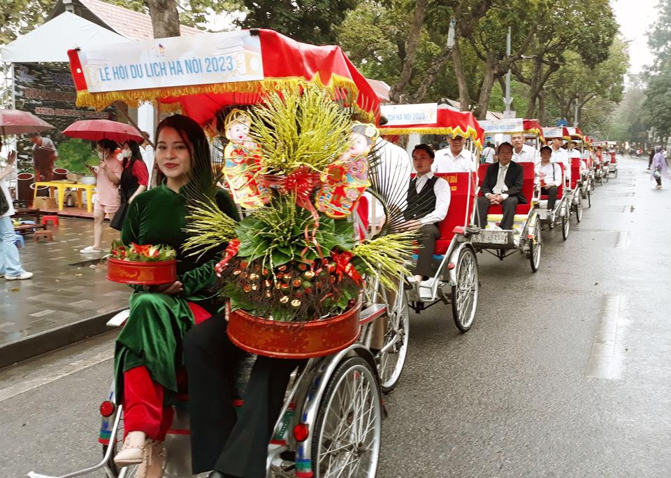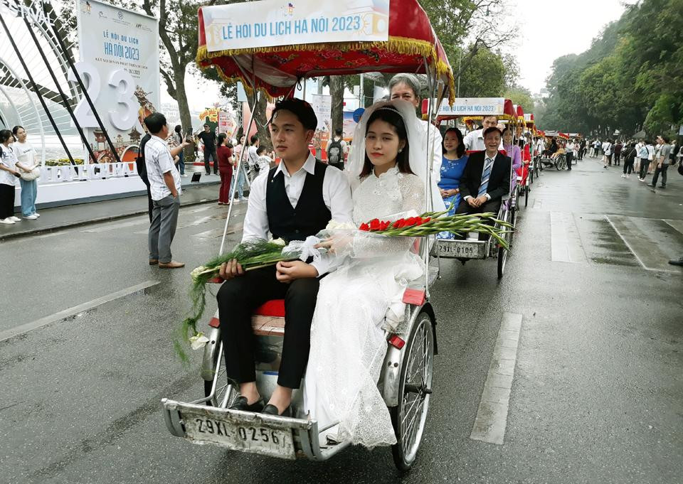 The bridal procession in the 80s-90s of the 20th century by cyclo at the Hanoi Tourism Festival 2023. Photos: Hoai Nam/ The Hanoi Times |