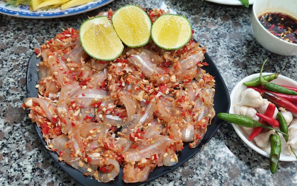 At Quy Nhon street eateries, which sell the white sardine salad, the flesh is mixed with minced chili and garlic, tamarind and some seasonings, after which crushed roasted peanuts are sprinkled on top. Diners squeeze lemon juice evenly over the dish to enjoy it.