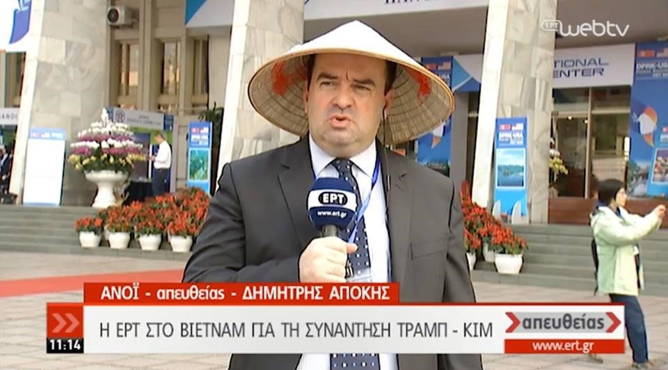 They say when in Rome, do as the Romans do. Well the same could be said for this Greek news journalist who reported from Hanoi wearing a traditional Vietnamese conical hat.