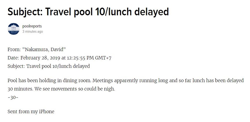 Chairman Kim and President Trump are going to have to wait a little longer for their lunch. We’ve been told the meeting is running late so it will be at least another 30 minutes before the leaders can sit down for something to eat. Here’s an email from pool reporter David Nakamura of the Washington Post.