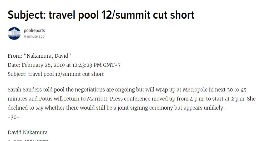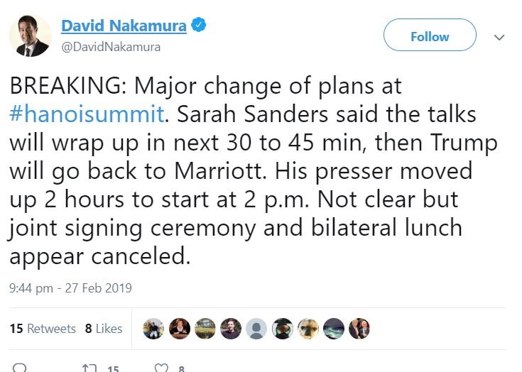 The motorcade of Chairman Kim has left the Metropole Hotel. So did Trump. Both ahead of schedule.