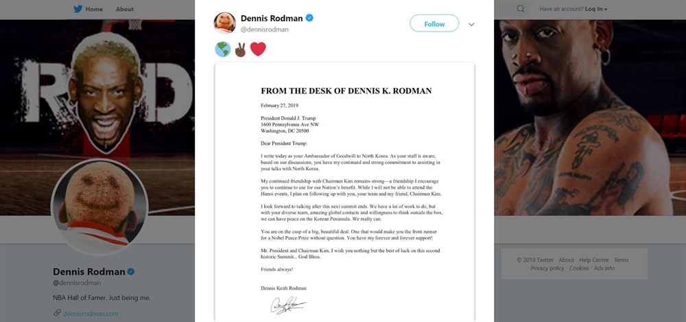 Dennis Rodman, the flamboyant former NBA champion and buddy of Chairman Kim, has gotten in on the action. He’s written a letter to President Trump suggesting he could be in line for a Noble Peace Prize (Trump, not Rodman!)