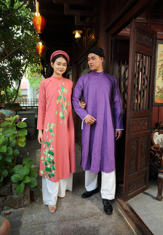 Each design in the collection blends traditional values with modern touches. Materials like Ma Chau silk (from Quang Nam), Nha Xa silk (from Duy Tien), and lightweight woven linen were skillfully crafted by artisans to create comfortable five-panel Ao Dai outfits.