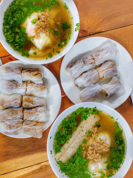 What makes the former standout is the accompanying soup bowl. Instead of dipping these rolls in fish sauce, the people of the northeast region make their own style of eating Banh cuon with hot bone broth, Gio lua or Vietnamese pork bologna, and lots of coriander.