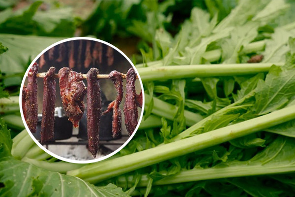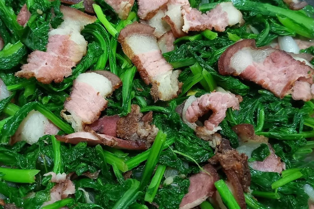 This dish combines savory smoked pork, blanched briefly before being stir-fried with cai meo - a leafy green with a robust, slightly bitter taste and a sweet aftertaste that makes it increasingly enjoyable with each bite.
