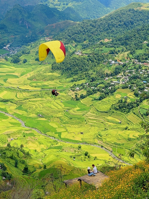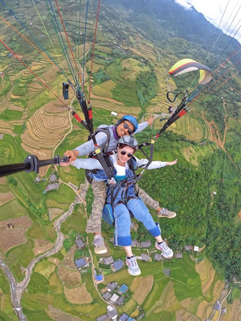 | FREE AS A BIRD: Visitors experience paragliding at Cao Phạ Pass, Mù Cang Chải District, Yên Bái Province. Photo courtesy of Mebayluon Paragliding. |