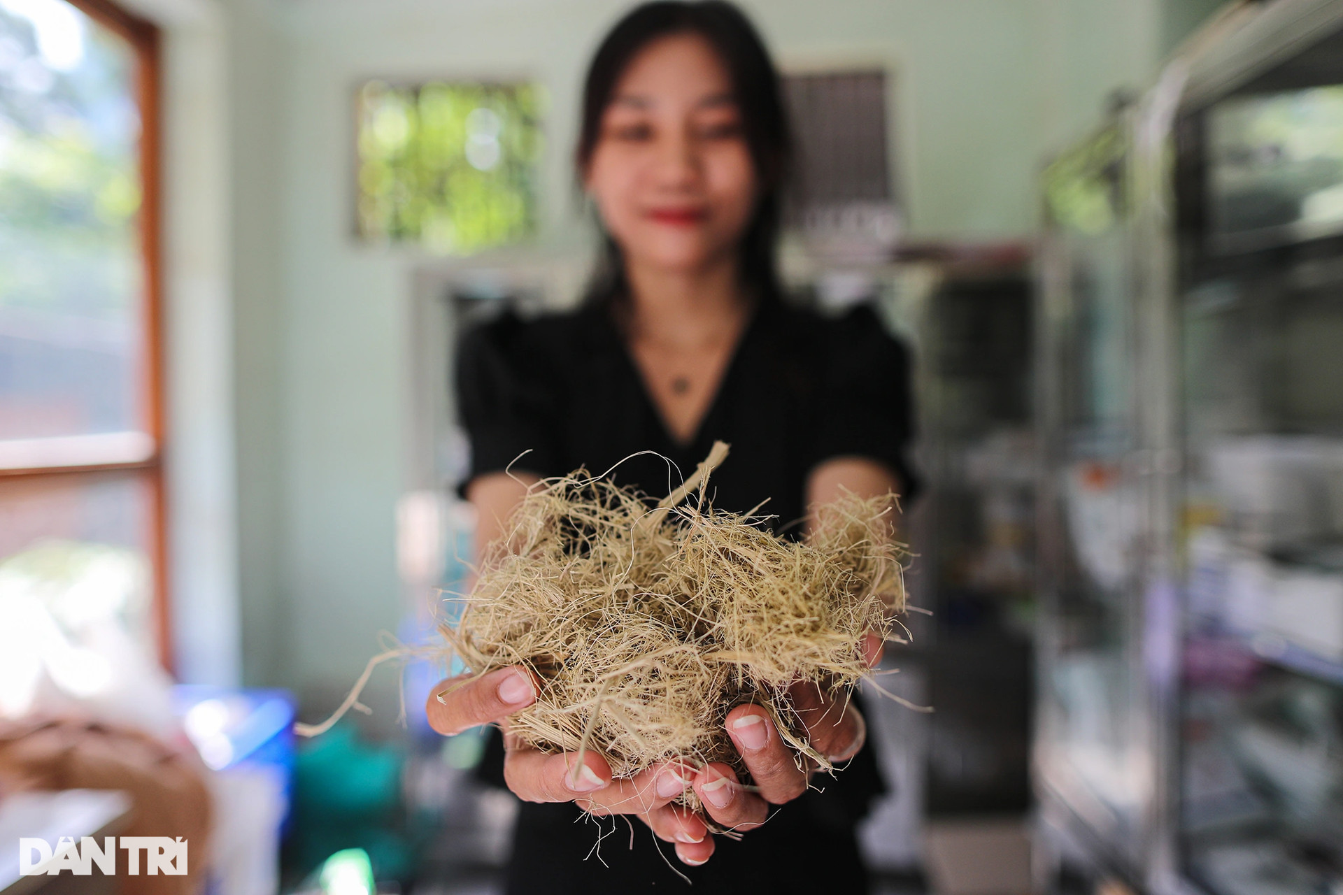 Nguyen Kieu Tuyet Ngan, 22, from Poo Poo Papers Group shows the dry fibres. They collect two kilos of dry fibre from five kilos of elephant dung.