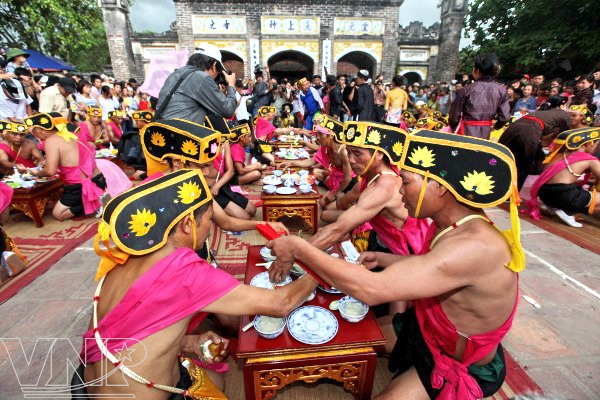 The main festival day was on April 9 with a performance called “Phu gia” of Saint Giong’s troops. The troops consist of 120 men about 18-36 years old. They were divided into 6 armies marching back and forth in step, showing the image of a disciplined and warlike army.