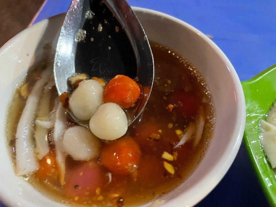 Subsequently, these rice balls are immersed in a pot of boiling water. Once cooked, the balls are placed in a small bowl and adorned with a special sugar sauce, coconut cream, and sliced ginger.