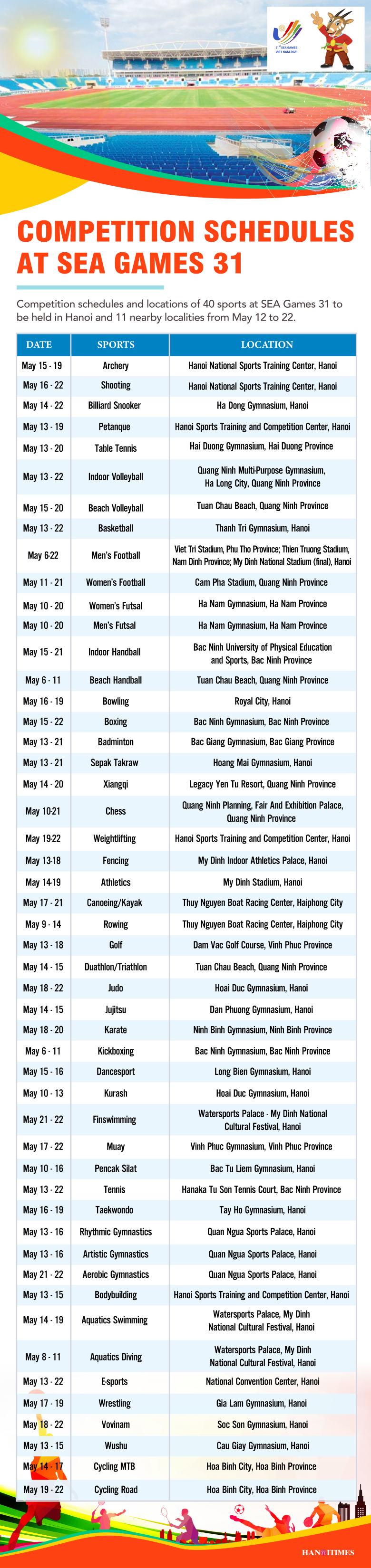 Athletes will compete in 40 sports in Hanoi and 11 nearby cities and provinces from May 6 to May 22.