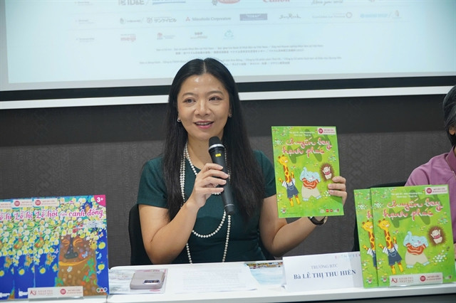 Lê Thị Thu Hiền, founder of Bắc Cầu Fund introduces an ehon book at the press conference.