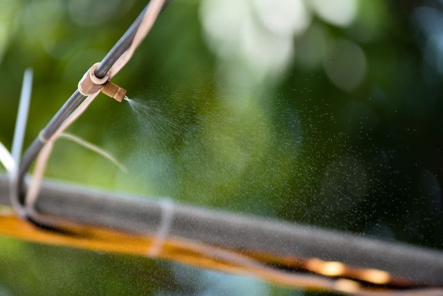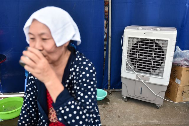 Each shelter is also equipped with tables and chairs and electric fans with water spray.