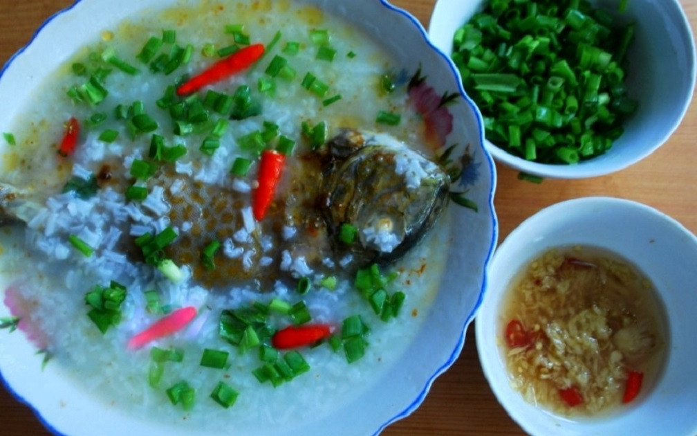 Diners can savor a bowl of dia bong fish porridge garnished with chopped green onions and a sprinkle of chili powder atop the porridge. Some opt for a chili fish sauce drizzle to further elevate the dish’s flavors.