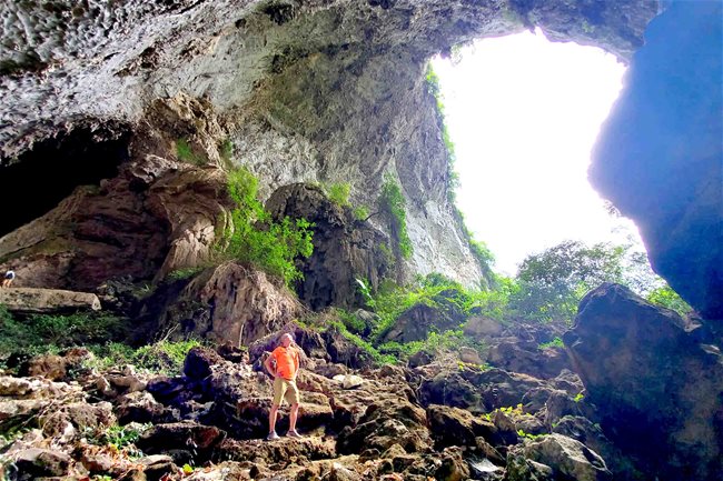 An explorer poses for a photo in a cave in Ngu Lao limestone mountainous area