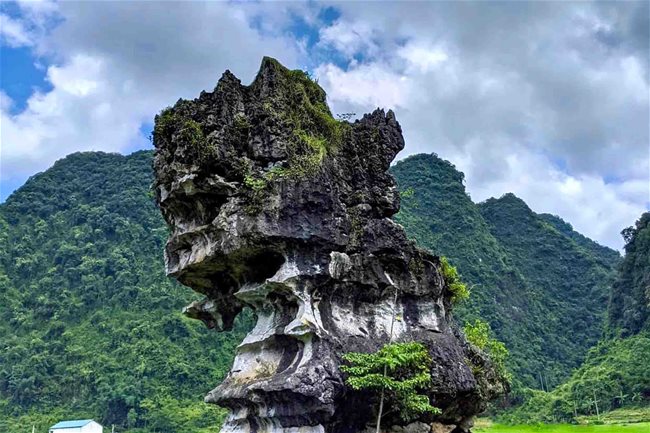 Travelers are sometimes enchanted by a giant lonesome limestone mass in unique shape in the rice field.
