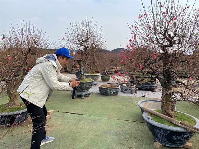 Vụ said the weather is quite good now with much sunlight in daytime and coldness at night, which is favourable for peach blossom bonsai to bloom in time.