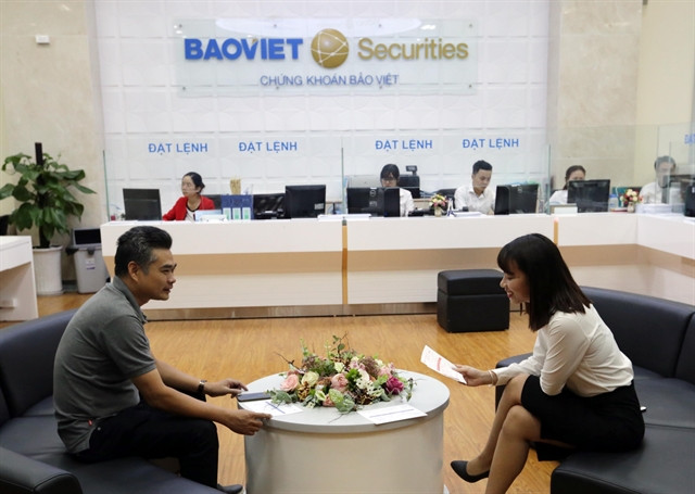 | A trader talks to a customer at Bảo Việt Securities' trading floor. — VNA/VNS Photo |
