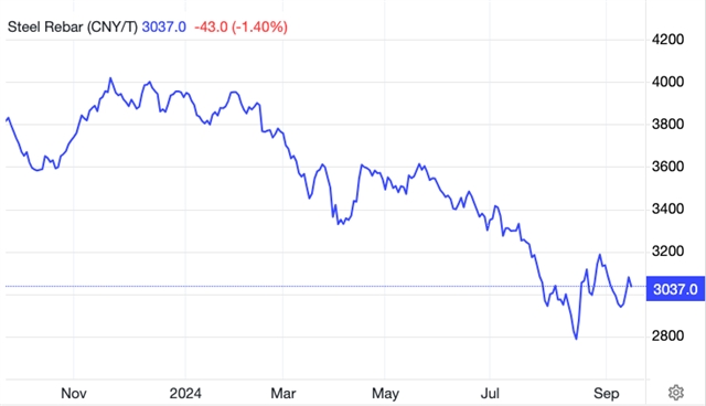| Steel rebar on the Shanghai Futures Exchange closed last Friday at CNY3,037 per tonne, down 1.4 per cent. Last week, price even broke below the 3,000 level. — Source: tradingeconomics.com |