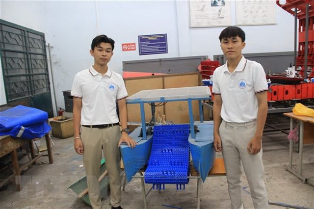 | Ngô Hoàng Thịnh (left) from Nha Trang University created a model waste collecting boat, powered by solar energy. — VNA/VNS Photo |