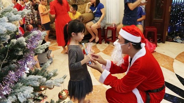 A student dressed up as Santa Claus deliver gifts to children at Christmas party in District 2. Playing the Father Christmas has been a popular seasonal job for students and fresh graduates in HCM City. — VNS Photo Dung Nguyen