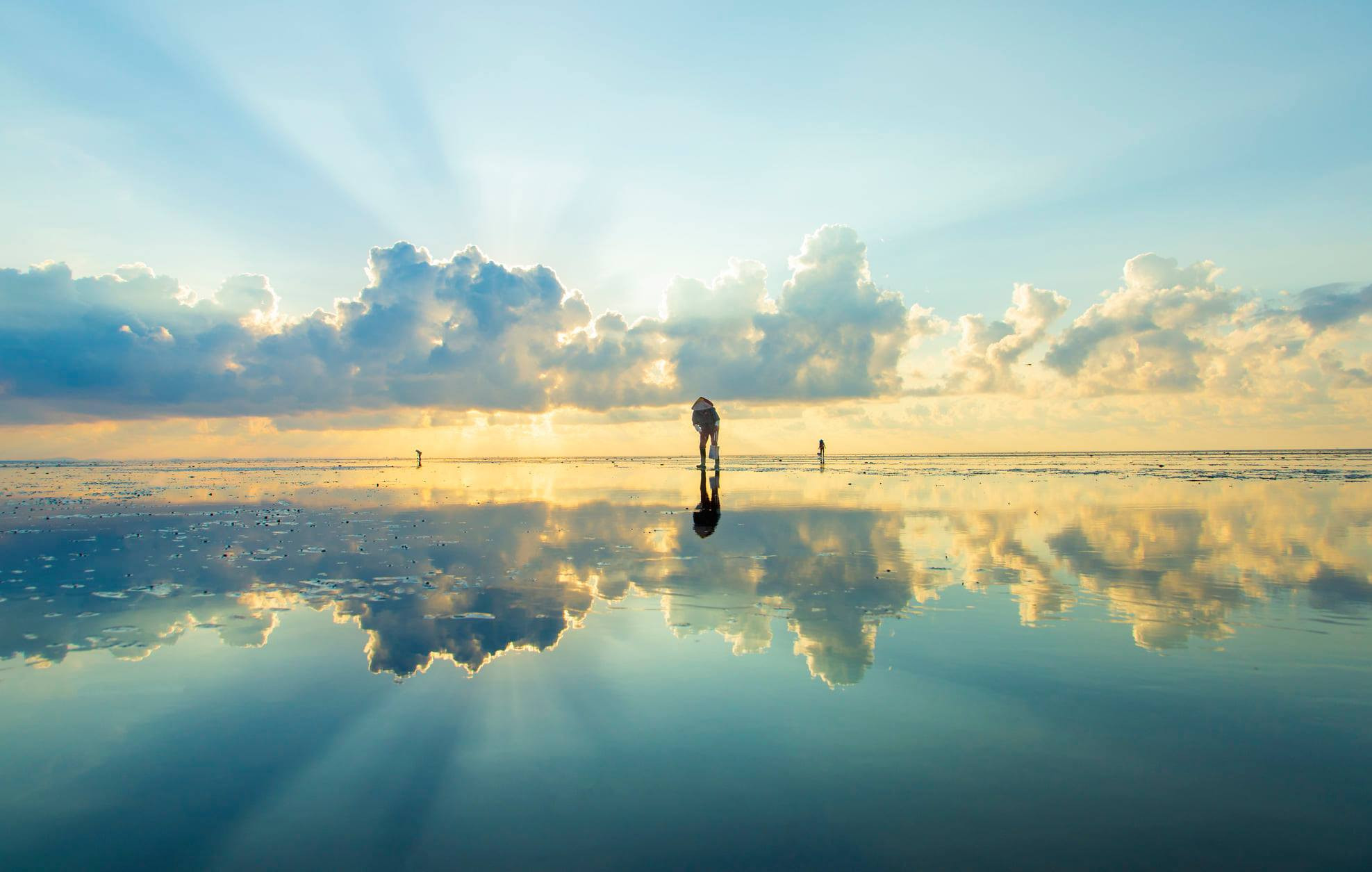 Quang Lang beach does not have white sand, clear blue sea or big waves, but has a peaceful and wild character with dark brown, flat and endless sandy beach. Early in the morning, when the water dries up, the sea surface is coated with a thin layer of water, only reaching the ankles, Quang Lang looks like a giant mirror reflecting the sky.