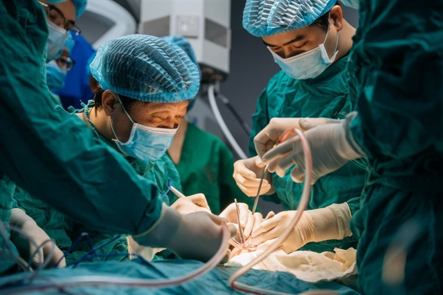 | Associate Professor Dr Vũ Quang Vinh (left) performs surgery with his colleagues. — Photo qdnd.vn |